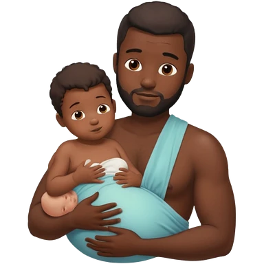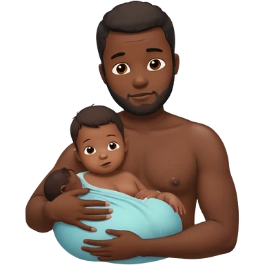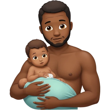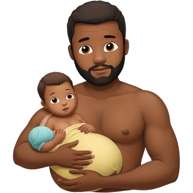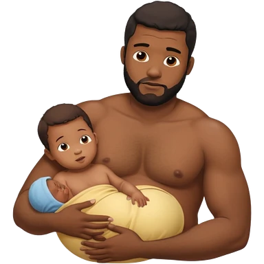 A shirtless pregnant burly black man breastfeeding his baby, thd baby is suckling on his nipple emoji