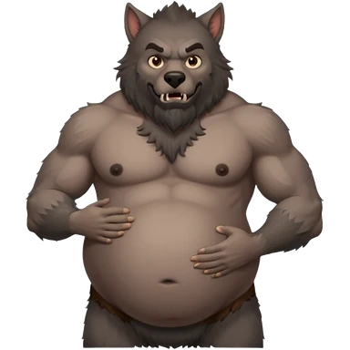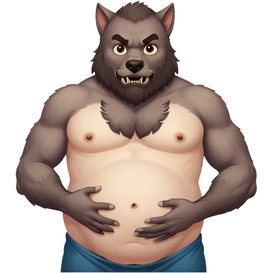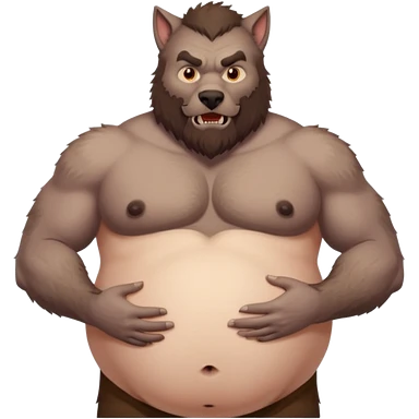 A shirtless pregnant burly male werewolf holding his pregnant belly, he has plump moobs and lactating nipples emoji