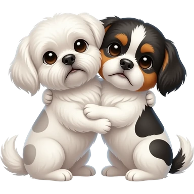 two Shih Tzu hugging one white one tricolor black light brown white emoji