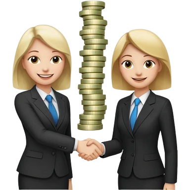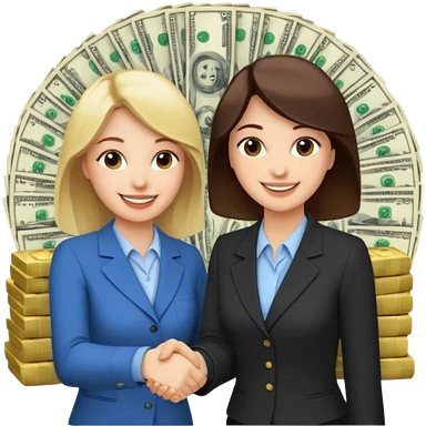 Девушка получает много денег и заключает выгодное сотрудничество. Она жмет руку коллеге и вокруг мешки денег emoji