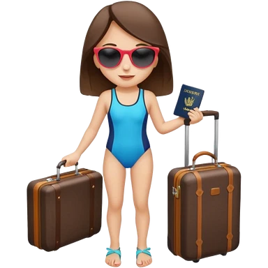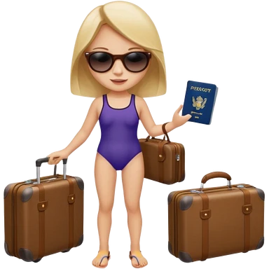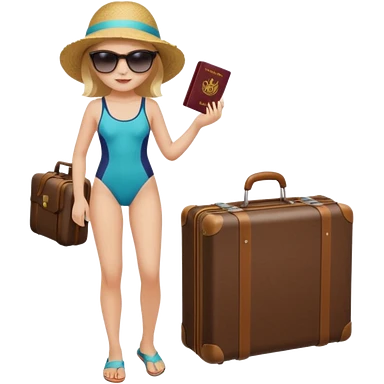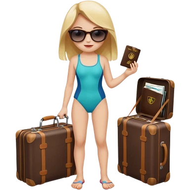 Девушка в путешествии, рядом чемодан, паспорт, очки и купальник emoji