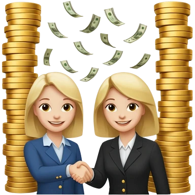Девушка получает много денег и заключает выгодное сотрудничество. Она жмет руку коллегам разным и вокруг мешки денег emoji