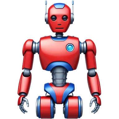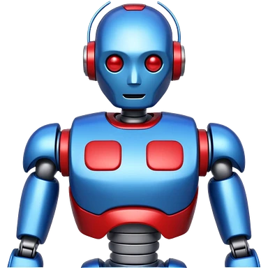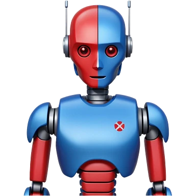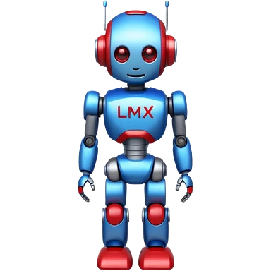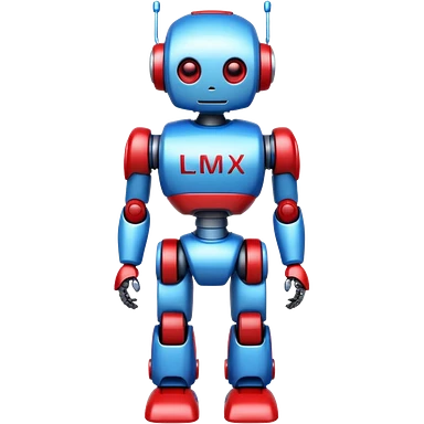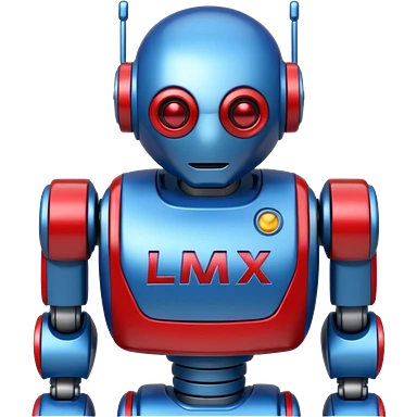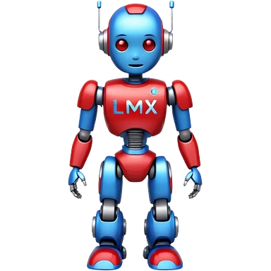 generate robot glossy, realstic, red and blue color, add text on chest "LMX" emoji
