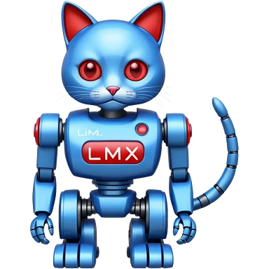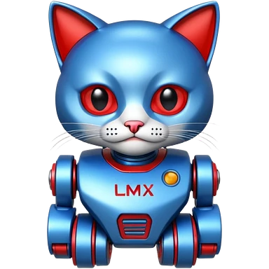 generate robot cat, glossy, realstic, red and blue color, write on text "LMX" emoji