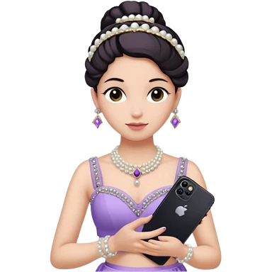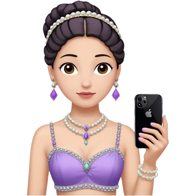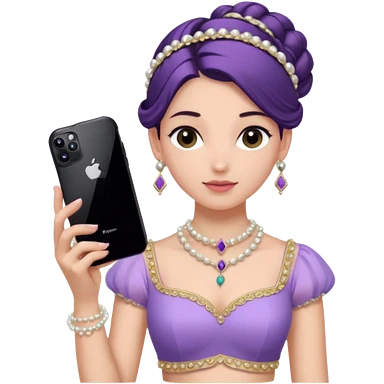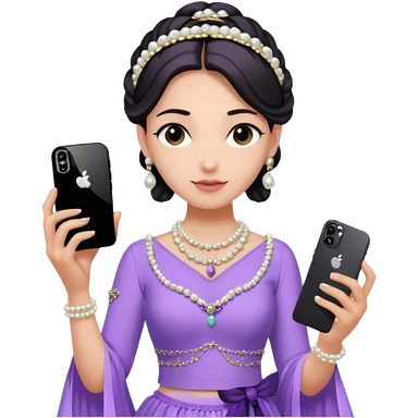 Make a girl standing in mirror in lavender lengha holding a iphone 16 pro max make her hair tie back side and a white pearl necklace emoji