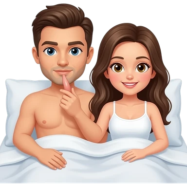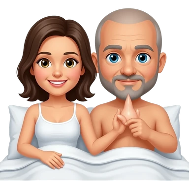 Man and woman in bed. The woman thin straggling hair. The man is fully bald with a grey goatee an a c emoji