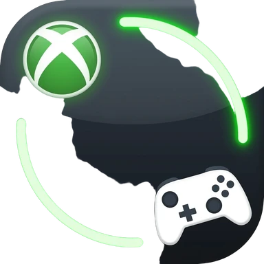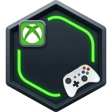 Hexagonal dark frame, neon green curved line around shape, Xbox logo badge on left, white gamepad silhouette bottom right, dark background, flat 2D game icon template, 1:1 emoji