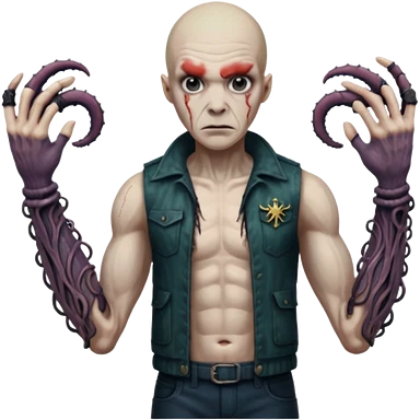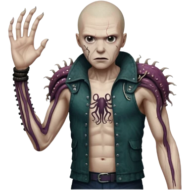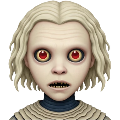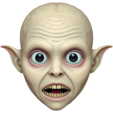 A man with sharp and thin face, brown round glasses, a brown hat and a brown costume with beige chemise (no blue shirt) (shoulders only), the man has blue eyes and a large smile on his face and menacing eyes. emoji