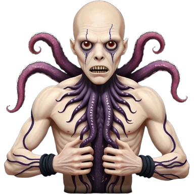 A man with sharp and thin face, brown round glasses, a brown hat and a brown costume with beige chemise (shoulders only), with blue eyes and a large smile on his face and menacing eyes. emoji