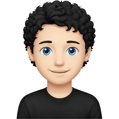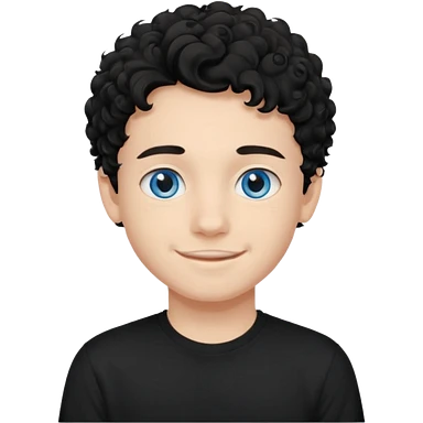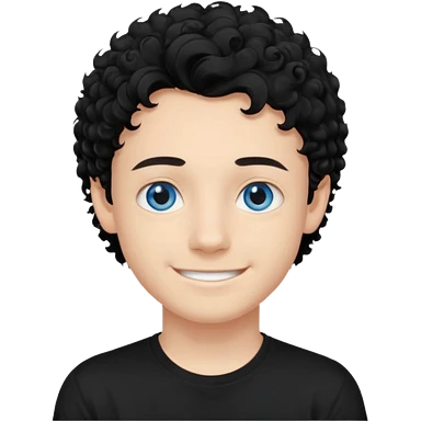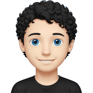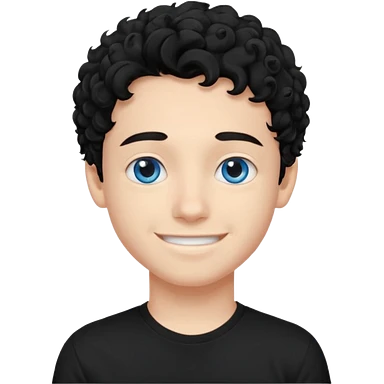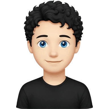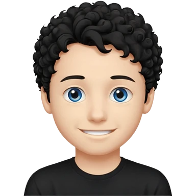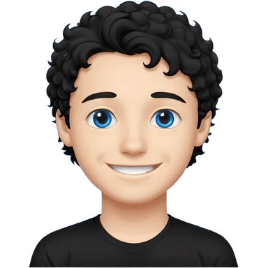 boy, young face like 20 years, blue eyes, medium curly hair black, easy smile, black t-shirt emoji