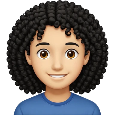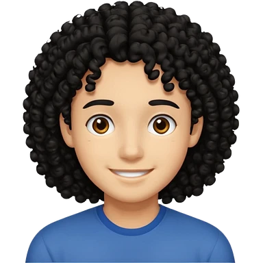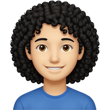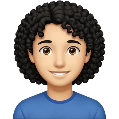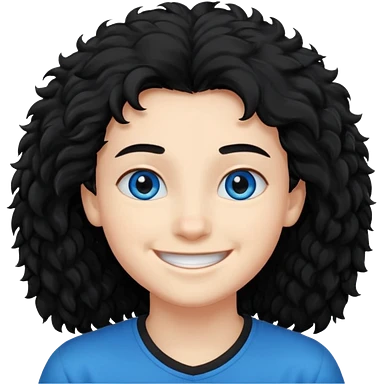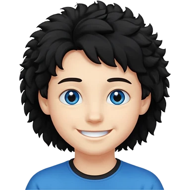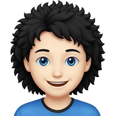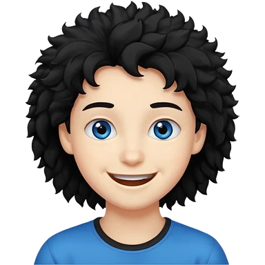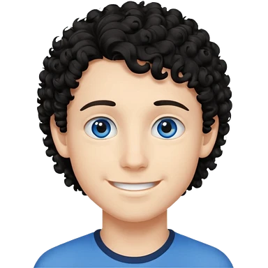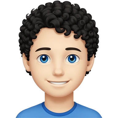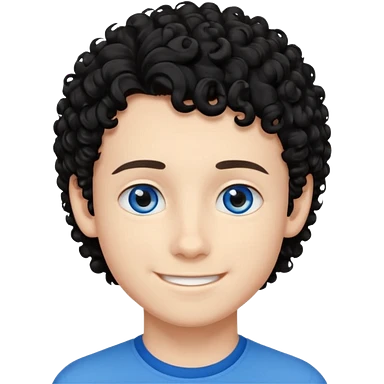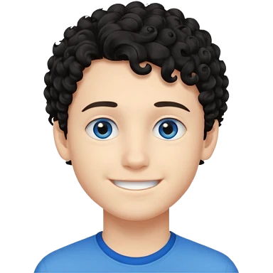 boy, young face like 18 years, blue eyes, medium curly hair black, easy smile emoji