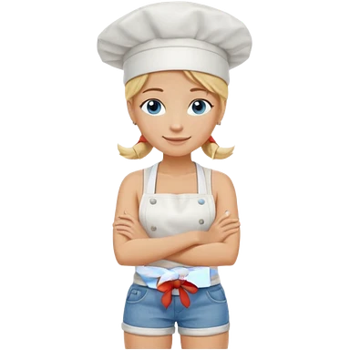 Sexy Full body pretty Long Blonde hair blue eyed female chef wearing white tank top, denim shorts and chef hat with arms folded emoji