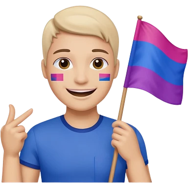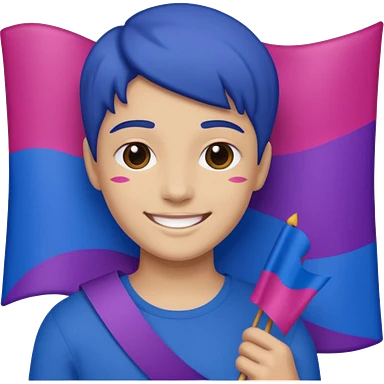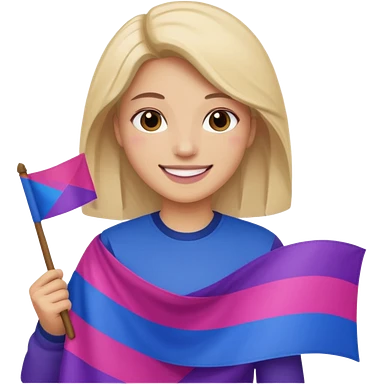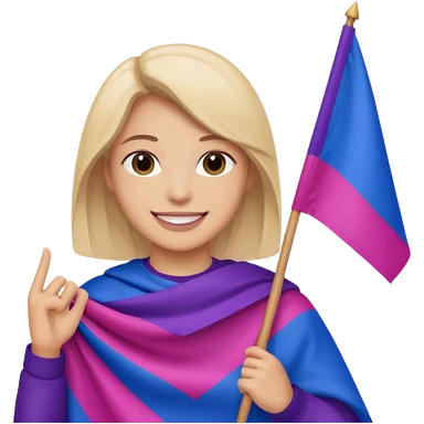 eu com a bandeira bissexual, sou morena, com cabelos negros que vão até a altura dos ombros levemente ondulados, olhos castanhos, emoji