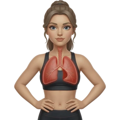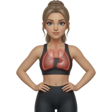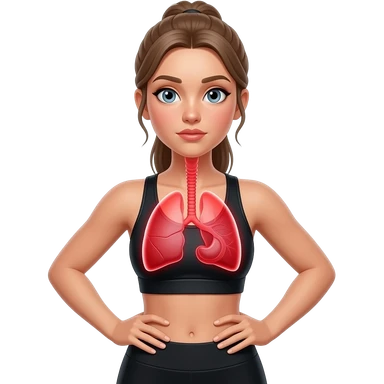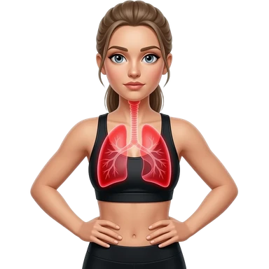 breathing, red glow on left and right lung, woman with hands on ribs, fair-skinned woman, gray-blue eyes, ash brown brows, ash light brown hair tied back, slim athletic body, black workout set emoji