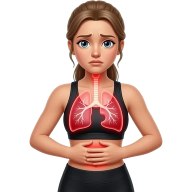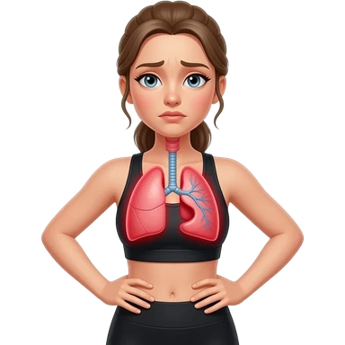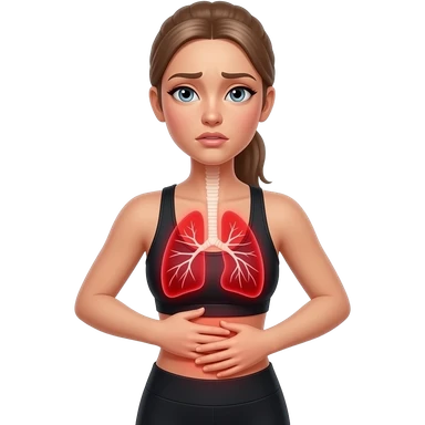breathing discomfort, red glow on left and right lung area, woman with hands on ribs, fair-skinned woman, gray-blue eyes, ash brown brows, ash light brown hair tied back, slim athletic body, black workout set emoji