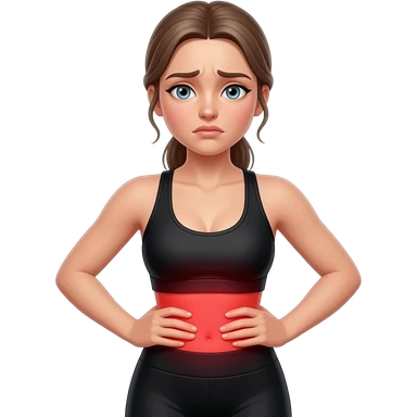 back pain, red glow on lower back, woman with hands on lower back, fair-skinned woman, gray-blue eyes, ash brown brows, ash light brown hair tied back, slim athletic body, black workout set, white background emoji