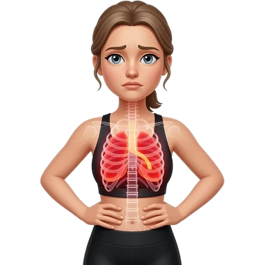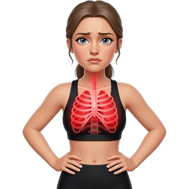 breathing discomfort, full red glow covering chest, ribs, and lung area, woman with hands on ribs, fair-skinned woman, gray-blue eyes, ash brown brows, ash light brown hair tied back, slim athletic body, black workout set emoji