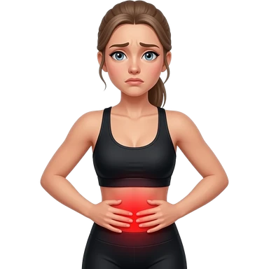 breathing discomfort, full red glow covering chest, woman with hands on ribs, fair-skinned woman, gray-blue eyes, ash brown brows, ash light brown hair tied back, slim athletic body, black workout set emoji