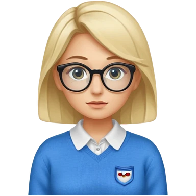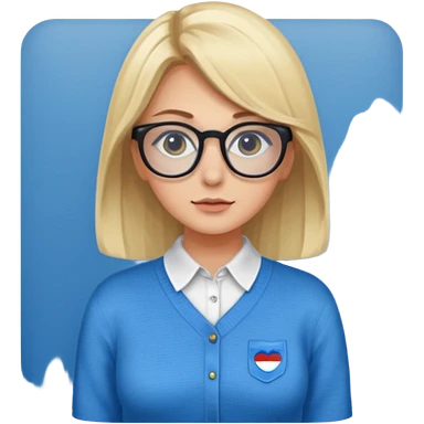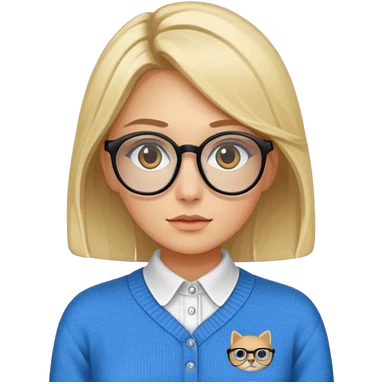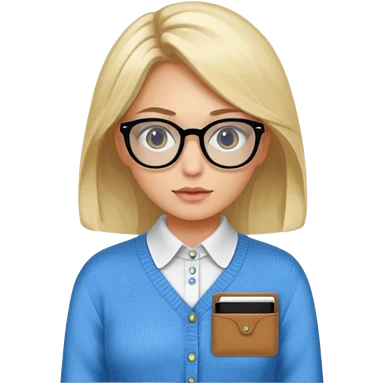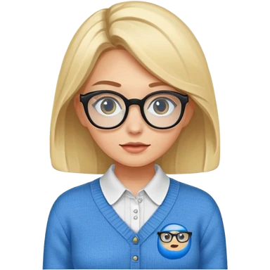 ragazza bionda vestita con camicia e maglione, con occhiali, occhi azzurri che è seduta al pc emoji