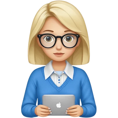 ragazza bionda vestita con camicia e maglione, con occhiali, occhi azzurri che è seduta al pc portatile emoji