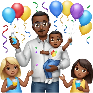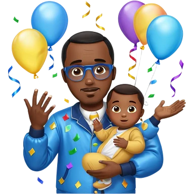 Diddy holding baby oil at a party with balloons and confetti and banners emoji