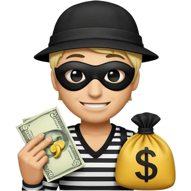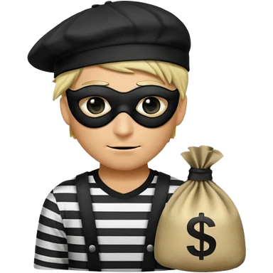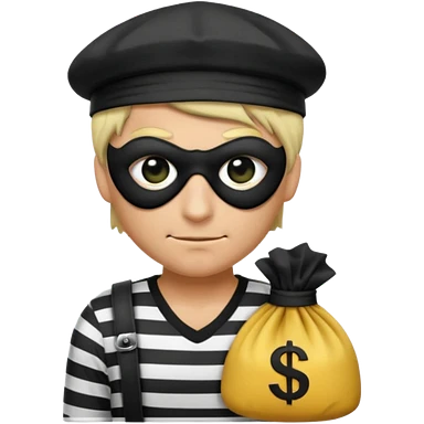 a short ios emoji-style portrait of a classic burglar, a black eye mask and a black-and-white striped shirt. emoji-like hair, black hat, a bag of money 💰 with a dollar sign in a right corner, evil expression emoji