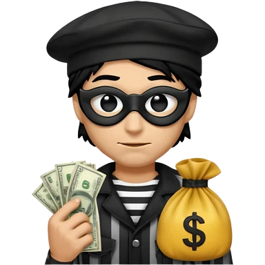 Realistic ios emoji-style portrait of a classic burglar, a black eye mask and a black-and-white striped shirt. emoji-like hair, black hat, a bag of money 💰 with a dollar sign in a right corner emoji