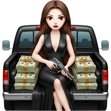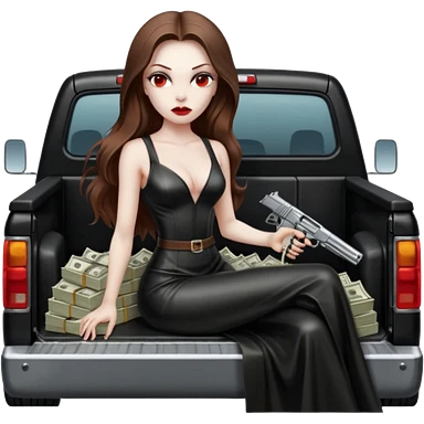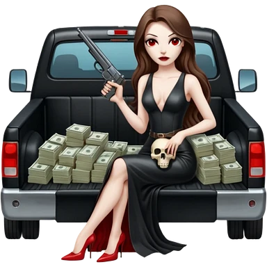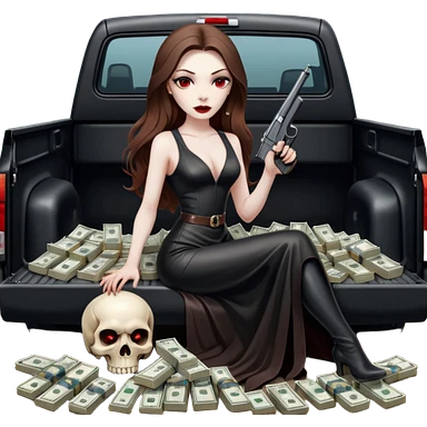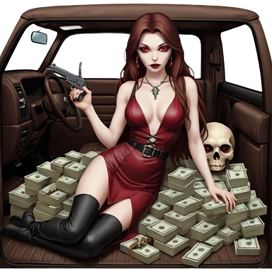 Lilith red eye seductress evil long brown haired sexy succubus woman with leather long seductive dress on, sitting in Big Large F350 pickup truck. Wearing super tall black platform high heels, Back seat full of stacks of cash, she is Holding a human skull of her enemies and a gun in other hand emoji