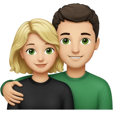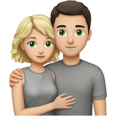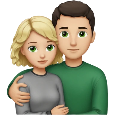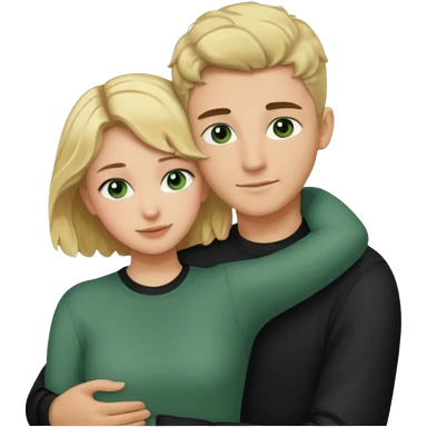 couple hugging. girl is blonde with wavy hair. man is tall with dark hair in a crew cut. both have green eyes. both are white people. emoji