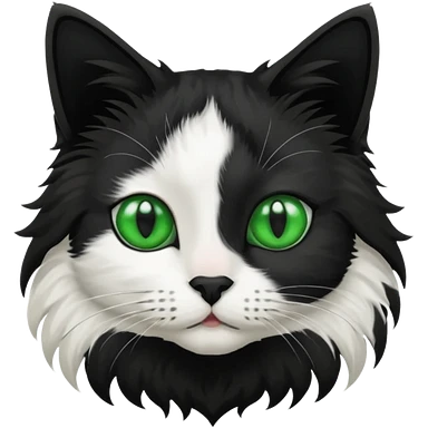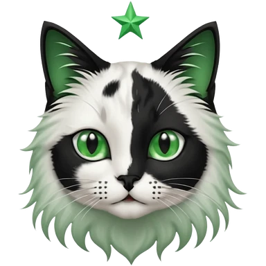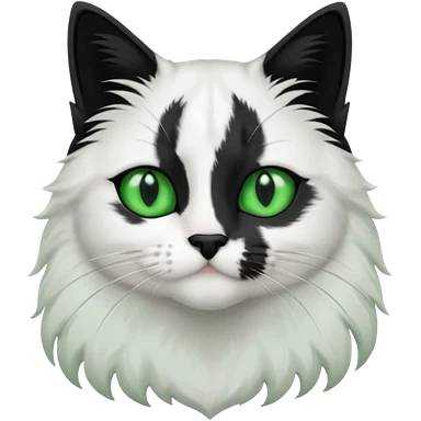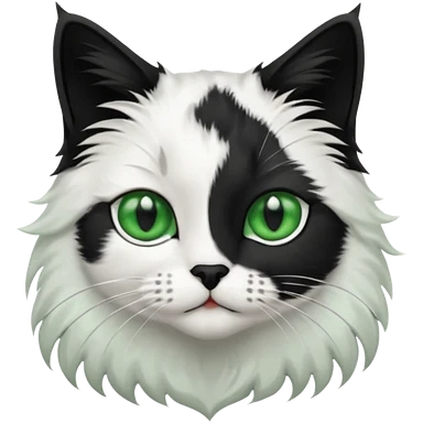 black and white long hair cat. green eyes. black nose. black splotch in the shape of a star near nose (on the right side). white chest. emoji