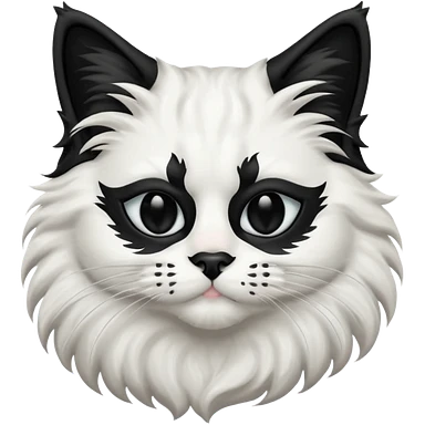 black and white long hair cat. black nose. black splotch near nose on the right side. black mask. white chest. emoji