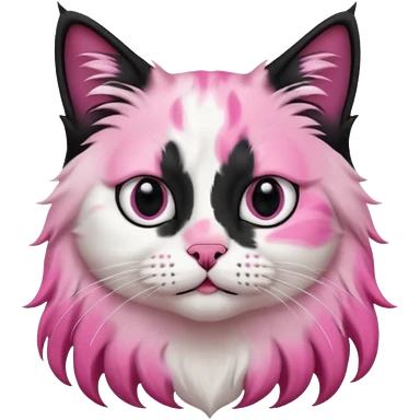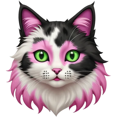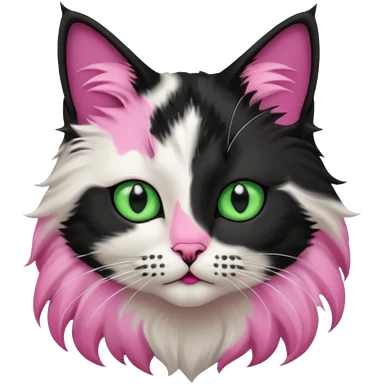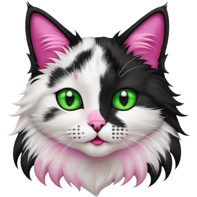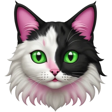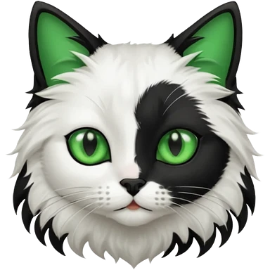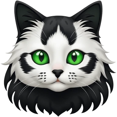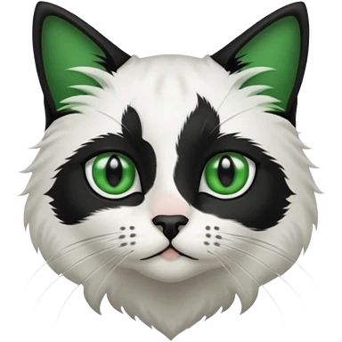 black and white long hair cat. green eyes. black nose and pink lips. black splotch in the shape of a star near nose (on the right side) emoji