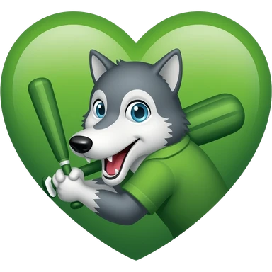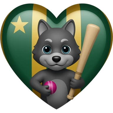 Dark Green and gold heart with a dark grey wolf holding a pink cricket ball and bat emoji