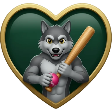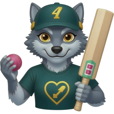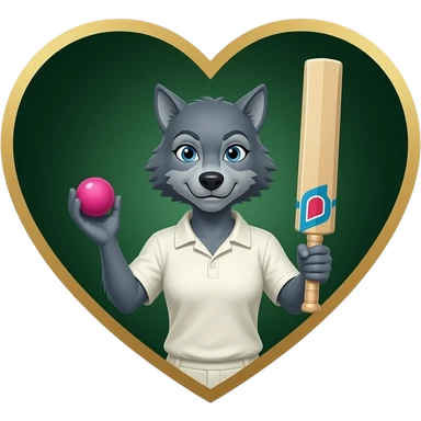Dark Green and gold heart with a tough dark grey wolf holding a pink cricket ball and bat emoji