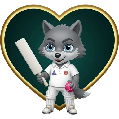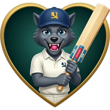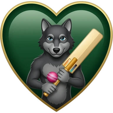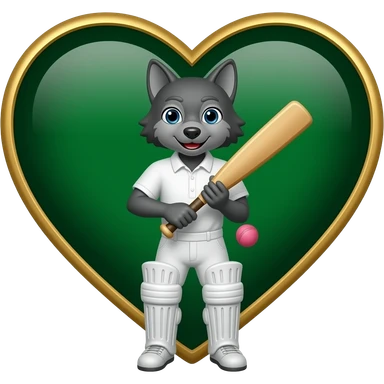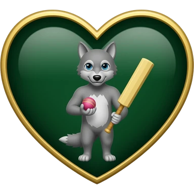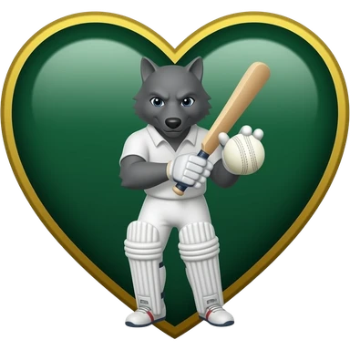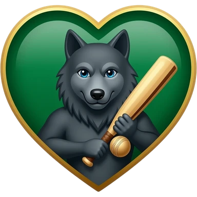 Dark Green and gold heart with a dark grey wolf holding a cricket ball and bat emoji