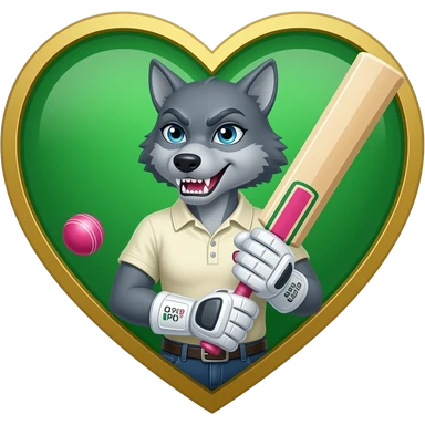 Dark Green and gold heart with a tough dark grey wolf holding a pink cricket ball and cricket bat emoji