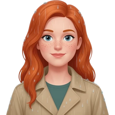 Redheaded women with freckles and fair skin in a raincoat with rain coming down emoji