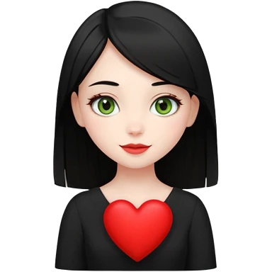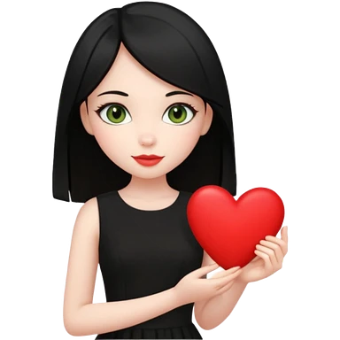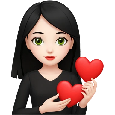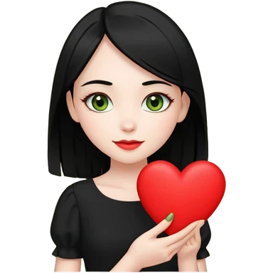 Pale girl with long black hair and olive green eyes wearing black dress and holding a heart emoji