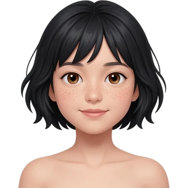 Mabel is a 19-year-old Japanese-American teenage girl with a slim build and fair skin. Hair: She has short, messy, neck-length black hair styled in a voluminous bob cut. Facial features: She has thick black eyebrows, brown eyes, and scattered freckl. emoji