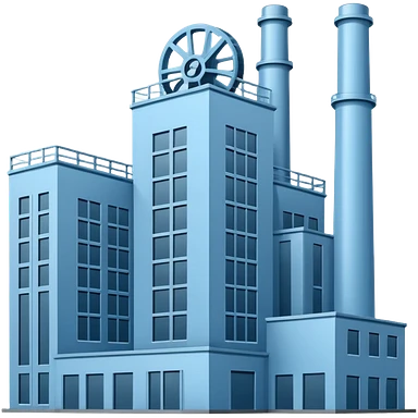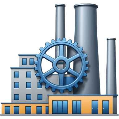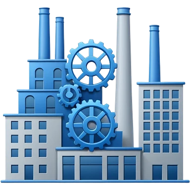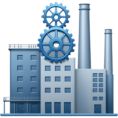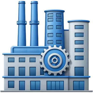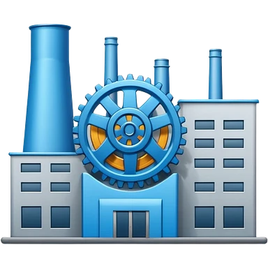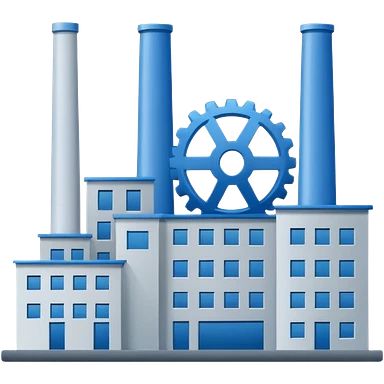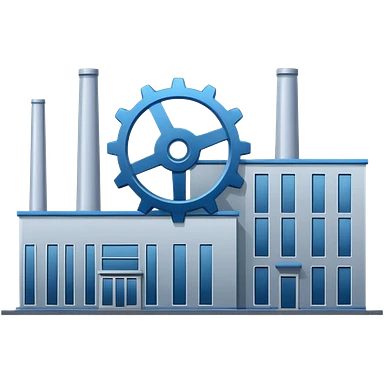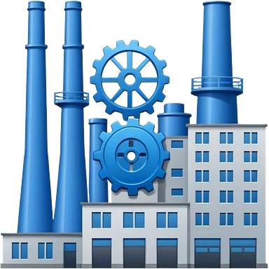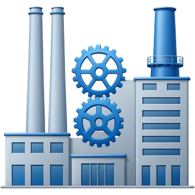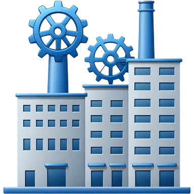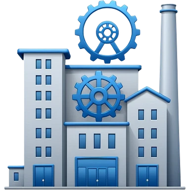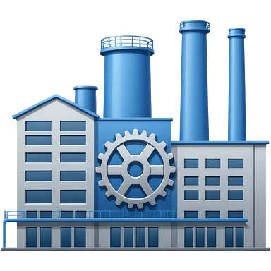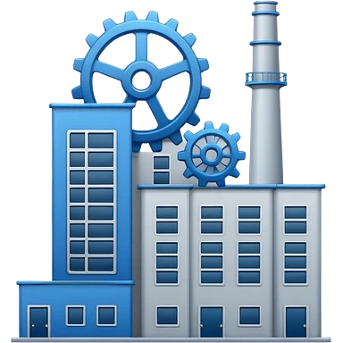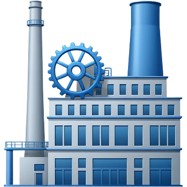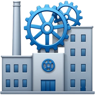 "A minimalist vector icon of a modern manufacturing factory building with a gear symbol above it. Blue and grey color scheme, flat design, white background, simple thick lines, professional business logo style." emoji
