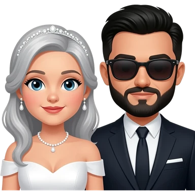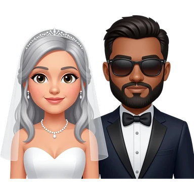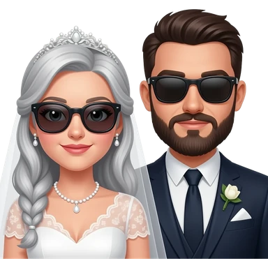 Grey haired bride with no sunglasses and a dark haired, bearded groom with sunglasses on emoji