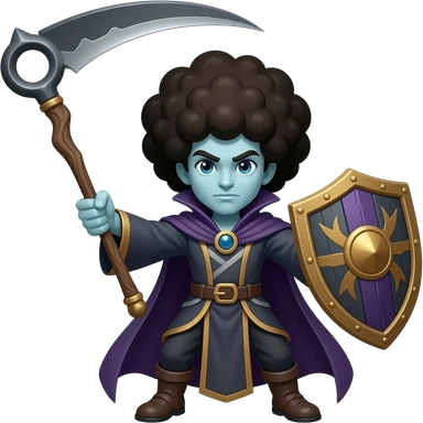 Necromancer guy with afro with scythe and shield, beating a mage emoji