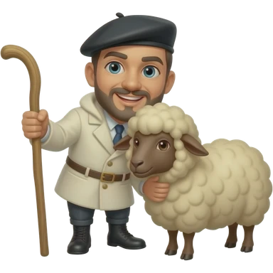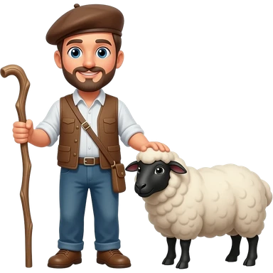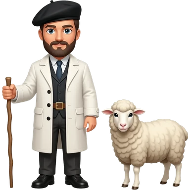 Un homme berger avec un manteau de laine blanche et un béret noir avec un bâton et un mouton emoji