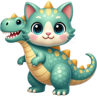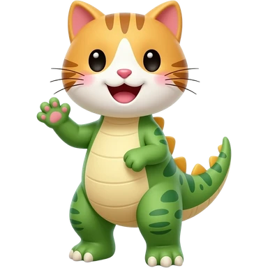 dinosaur body with cute kitty face standing on two legs looking happy and waving emoji