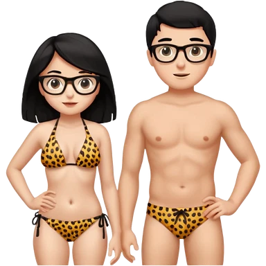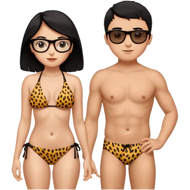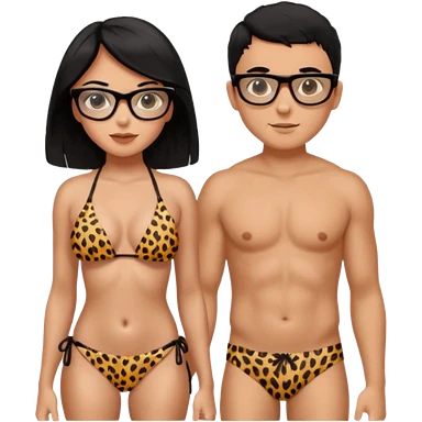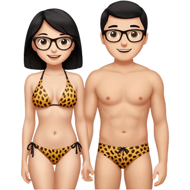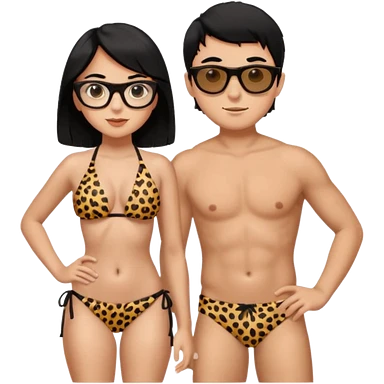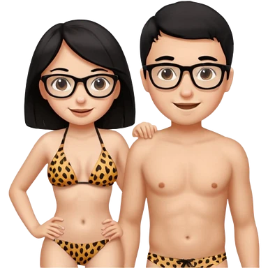 black haired girl with big boobs wearing a cheetah print bikini standing with a boy with black hair wearing glasses and shirt less emoji