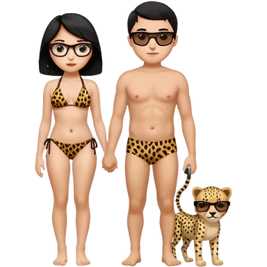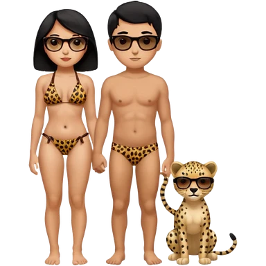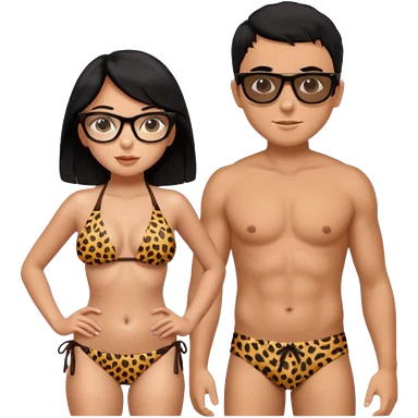 black haired girl with big boobs with shades on... wearing a cheetah print bikini standing with a boy with black hair wearing glasses and shirt less emoji