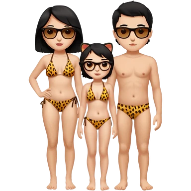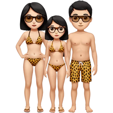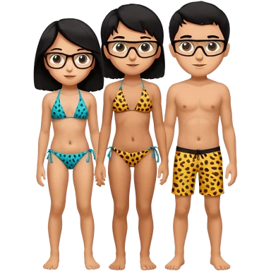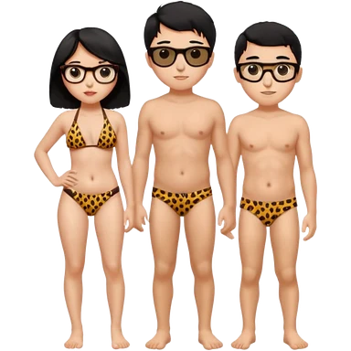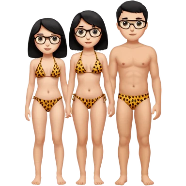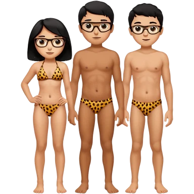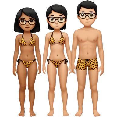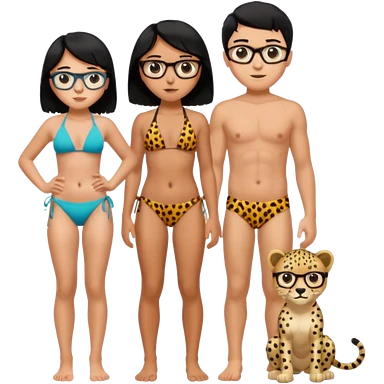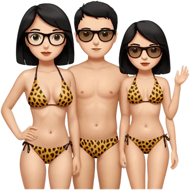 black haired girl with big boobs wearing a cheetah print bikini standing with a boy with black hair wearing glasses and shirt less girl with no glasses emoji