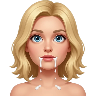 Naked white girl with blonde hair looking up with sticky white cum on her face emoji