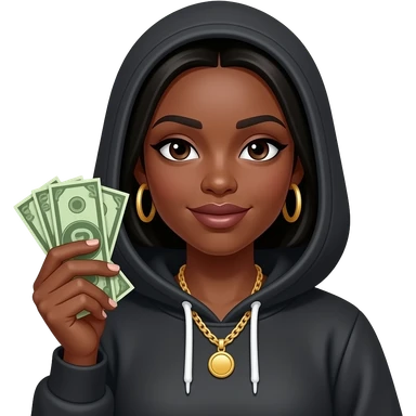 Dark skin woman in hoodie with cash looks like rapper emoji