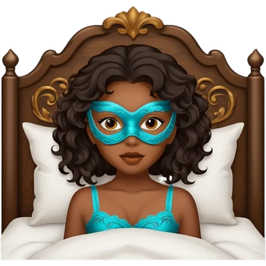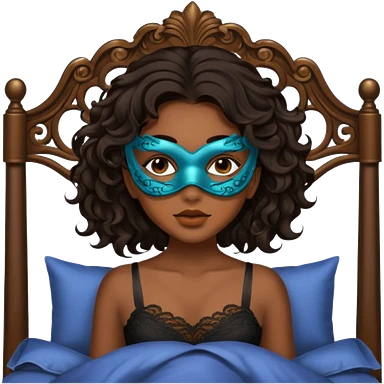 Um amenina super linda com cabelo marrom meio preto ondulado na cama com máscara no rosto emoji